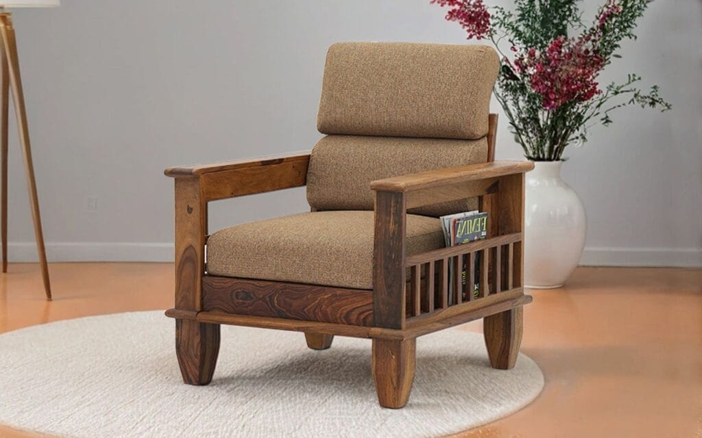 Introducing the Ishwar Interior Chola Sheesham Wood Single Seater Sofa, a striking blend of comfort and aesthetics. Crafted from premium Sheesham wood, this sofa promises durability and longevity, enhancing any living space with its rich, natural grains. The thoughtfully designed brown moulded foam cushion adds a layer of comfort, making it perfect for relaxation or casual gatherings.