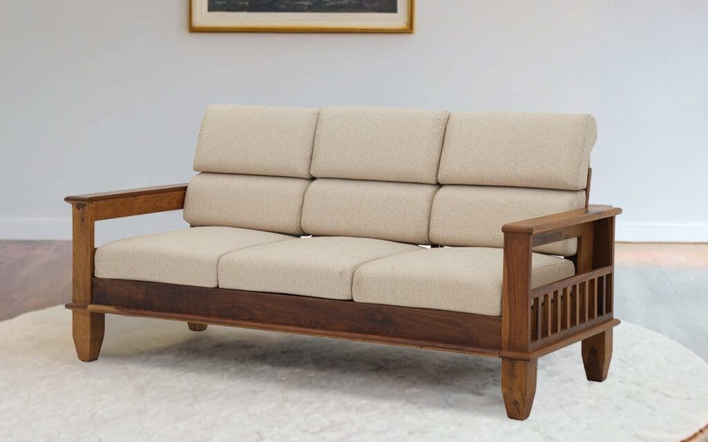 Ishwar Interior Chola Sheesham Wood Three-Seater Sofa with Beige CushionsIshwar Interior Chola Sheesham Wood Three-Seater Sofa with Beige Cushions