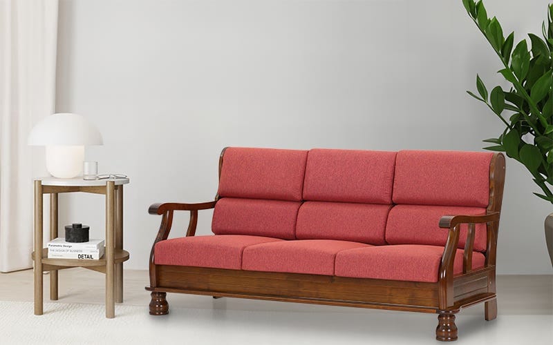 Enhance your living space with the Ishwar Interior Melaka Wooden Sofa, featuring elegant red cushions. This 3-seater combines style and comfort, perfect for relaxation and entertaining.