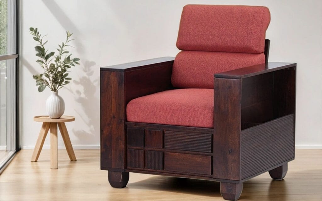 The Ishwar Interior Mourya Sheesham Wooden Sofa Single Seater is an exquisite addition to any living space. Crafted from high-quality Sheesham wood, known for its durability and rich finish, this sofa blends elegance with functionality. The striking red color cushion adds a pop of vibrancy and comfort, making it an inviting spot for relaxation. Its compact design makes it ideal for smaller spaces while providing ample support and style.